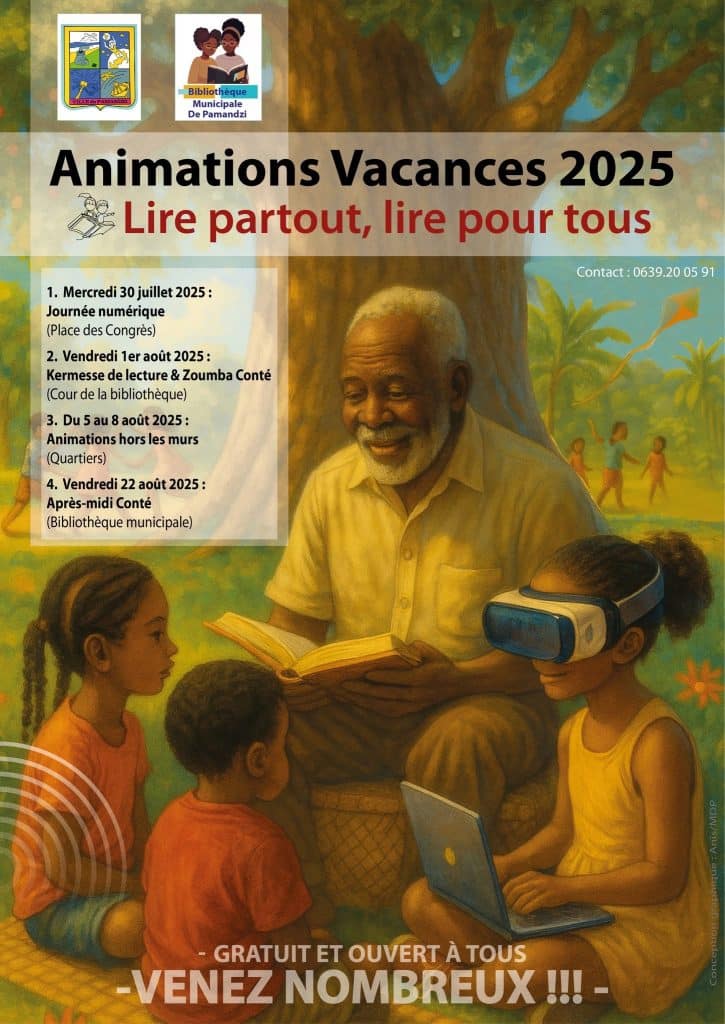 📚 Animations Vacances 2025 – Lire partout, lire pour tous ! Pendant les vacances, la Bibliothèque Municipale de Pamandzi sort de ses murs pour vous