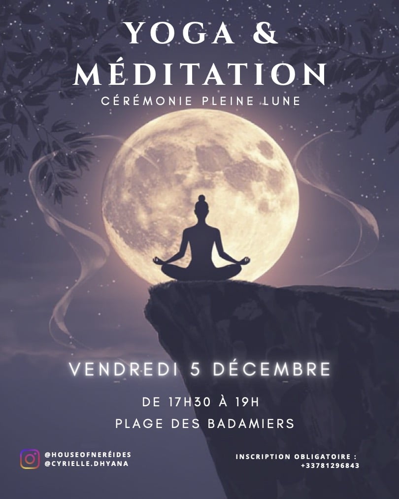 Offrez-vous un moment de reconnexion à vous-même lors de cette cérémonie de pleine lune, mêlant yoga doux, respiration consciente et méditation guidée, dans le cadre magique de la plage des Badamiers.